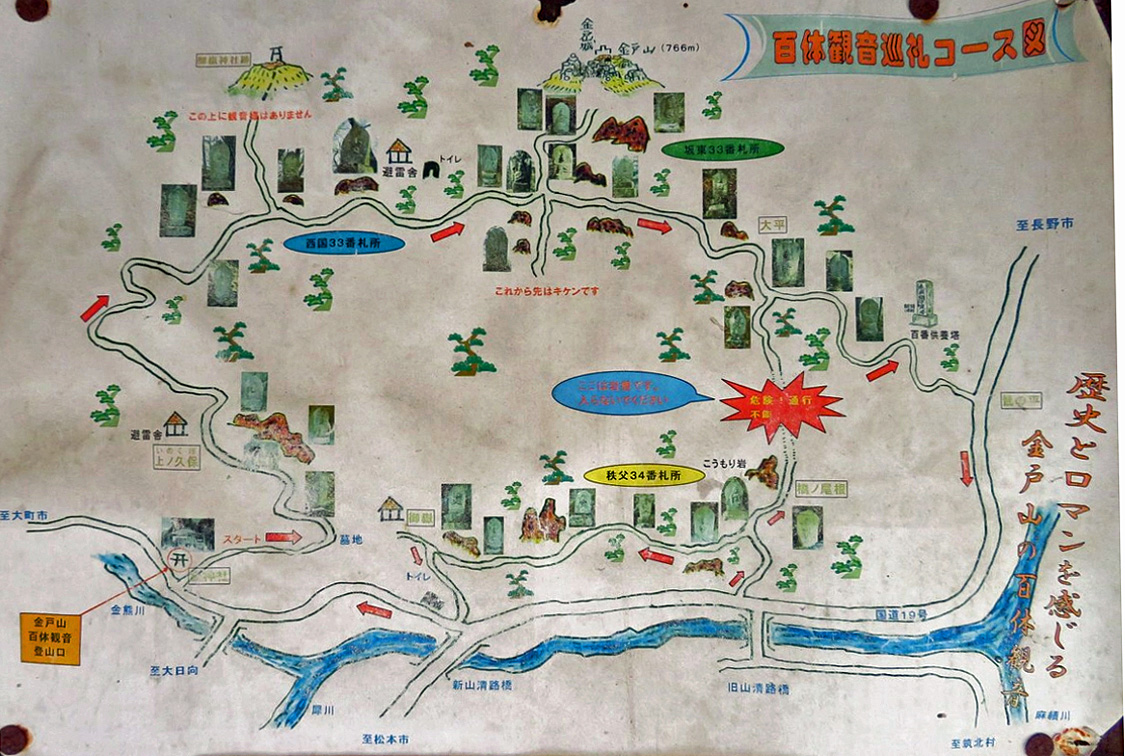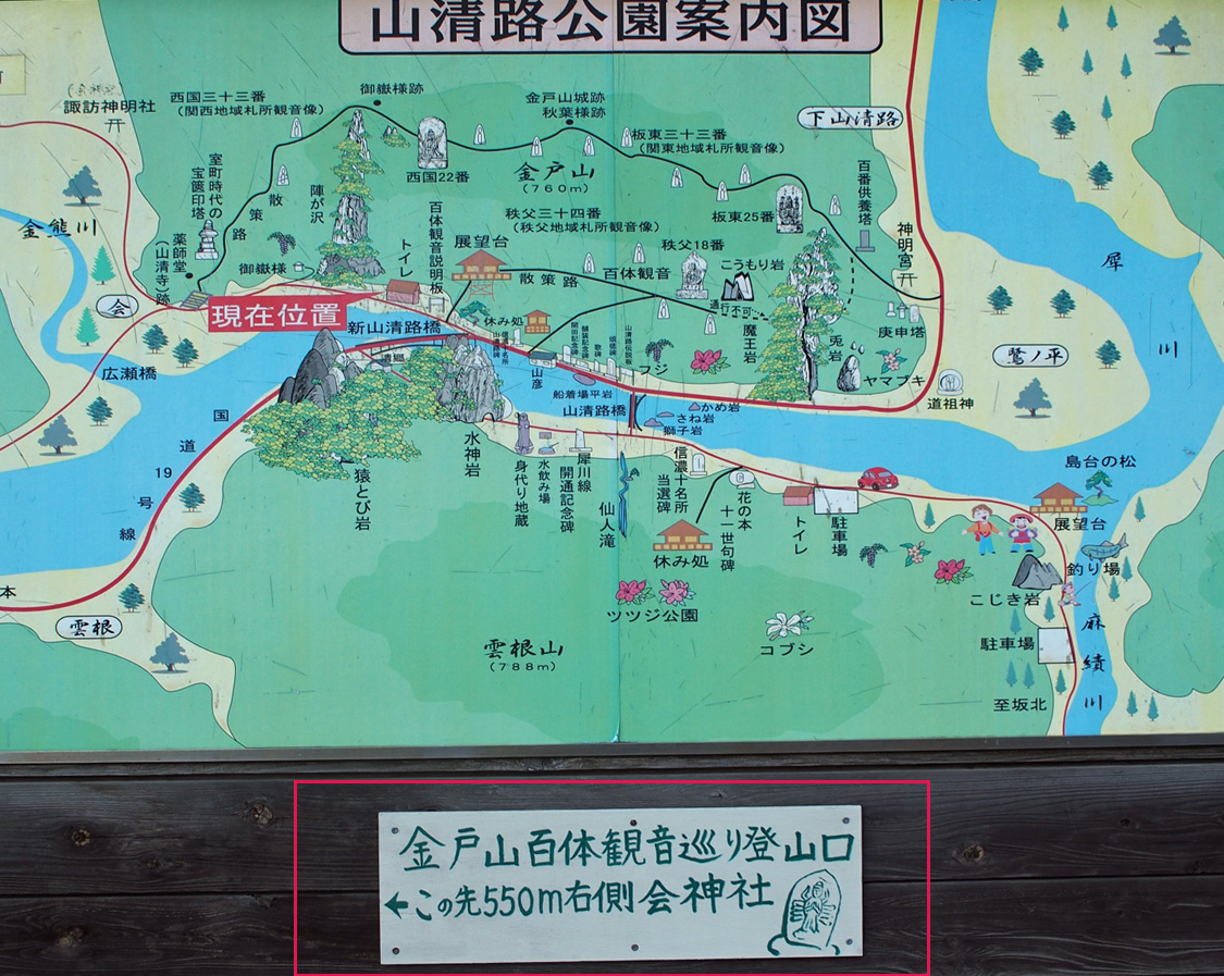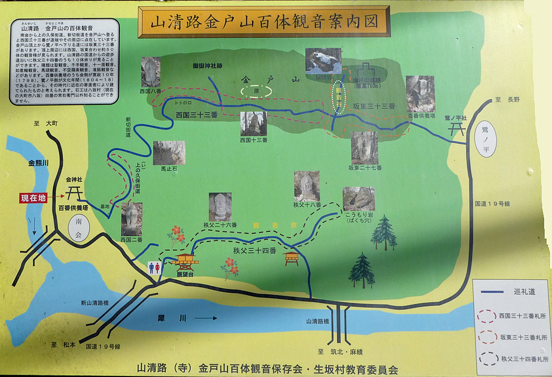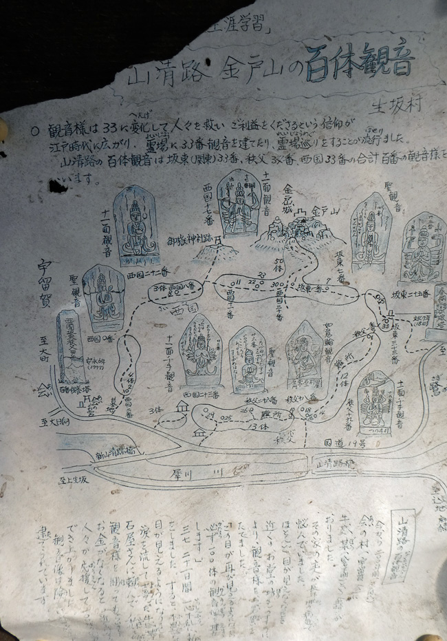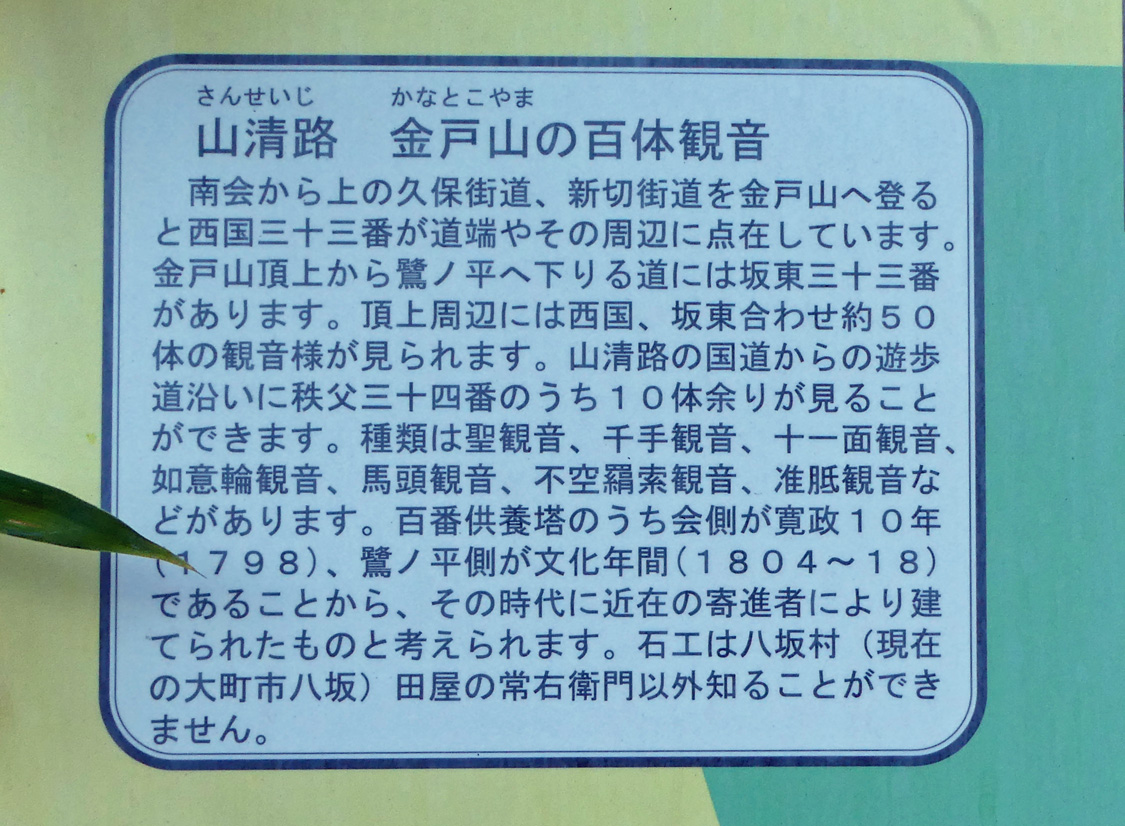会神社駐車場に設置された金戸山100体観音案内板 | ||||