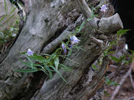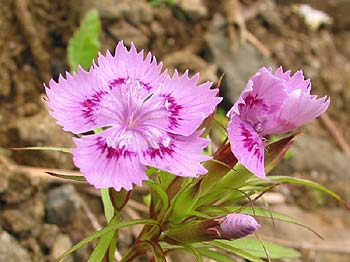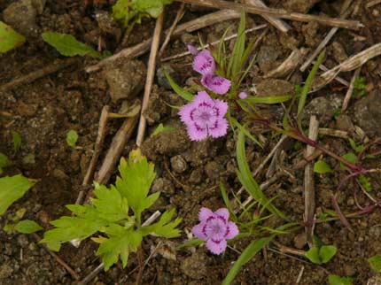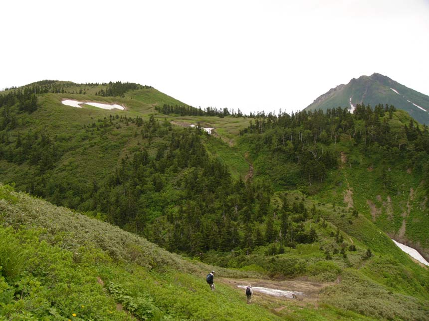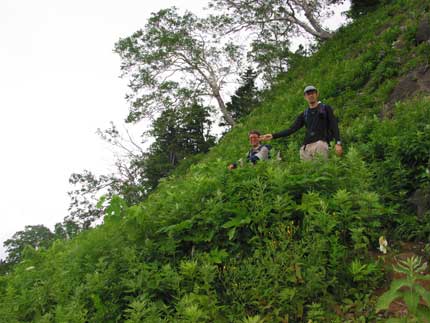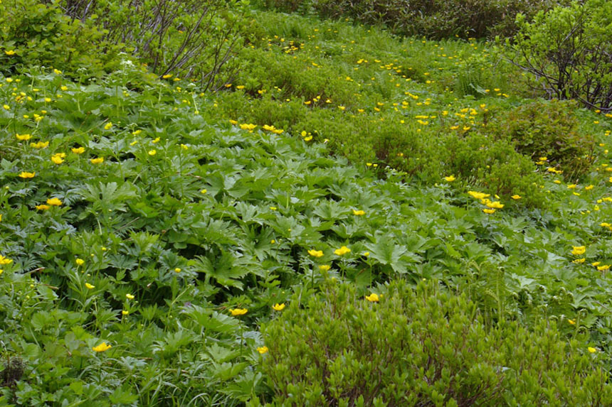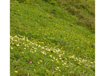 先にザレた急斜面が見え、このあたりから最初の花畑が見られる。