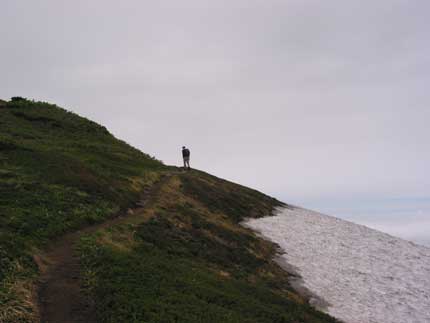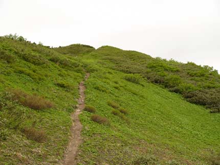 何回か上り返し、笹原の登山道を抜けると一面の草原にでる。 両脇に咲く花を眺めながら進むと天狗原
