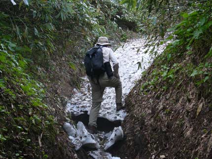 ブナの樹林帯をジグザグに登り、枯れた湿地帯を過ぎ左下から沢音が聞こえると間もなく水場にでる。