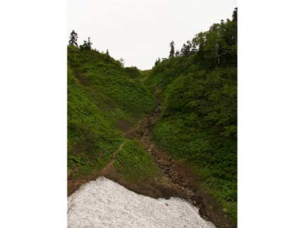 展望が良い岩場を左に巻いて雪解け水でぬかるむ登山道を慎重に登る。 沢道を抜け暫く進むと台地の