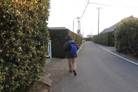 環境に優しい防風生け垣の住宅地を進む |