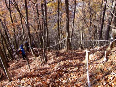 千憎坊からの下りは丸太の階段で、要所要所にはロープも張られているが、かなりの急坂なので足下に注