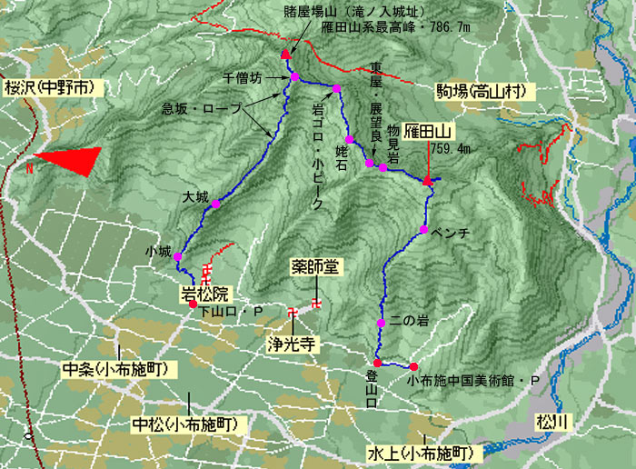 意が必要だ。 岩松院を眼下に望めるようになると苅田城と呼ばれた大城跡や小城跡を通過して岩松院の