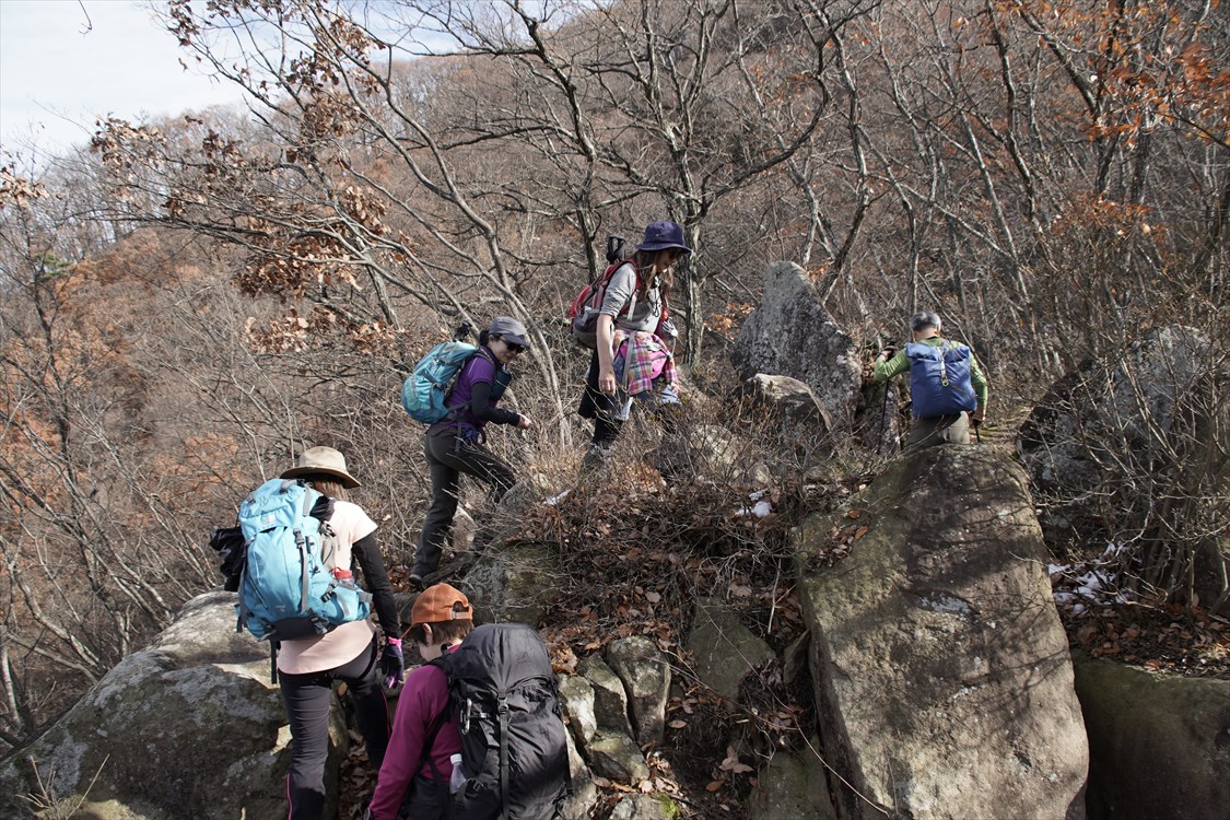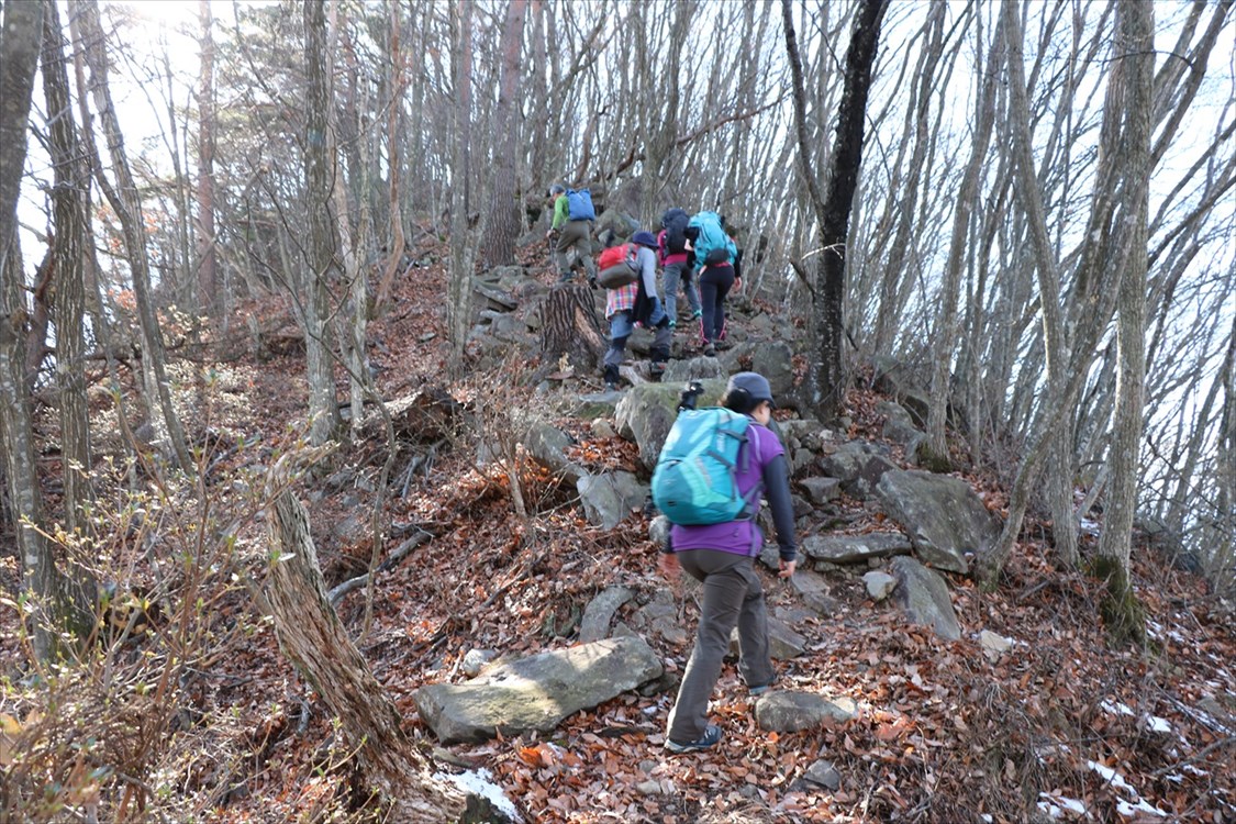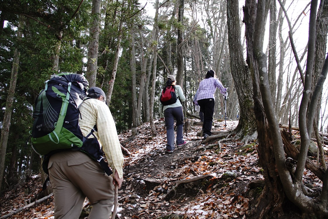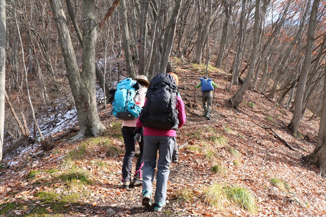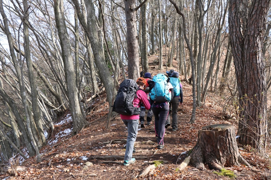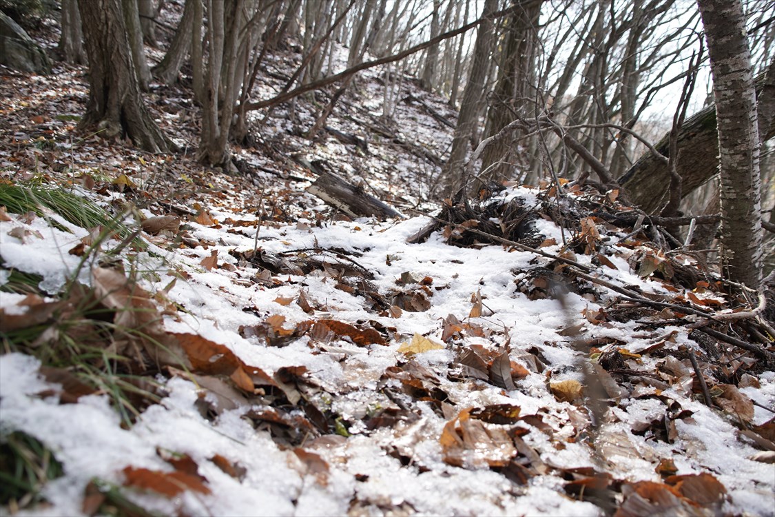 雁田山への稜線は前日の残雪が薄く残る 千僧坊から鬼のつぼや分岐点までは緩いアップダウンが連続する |