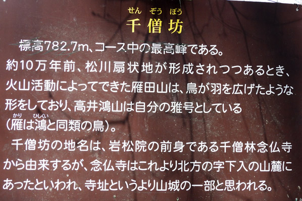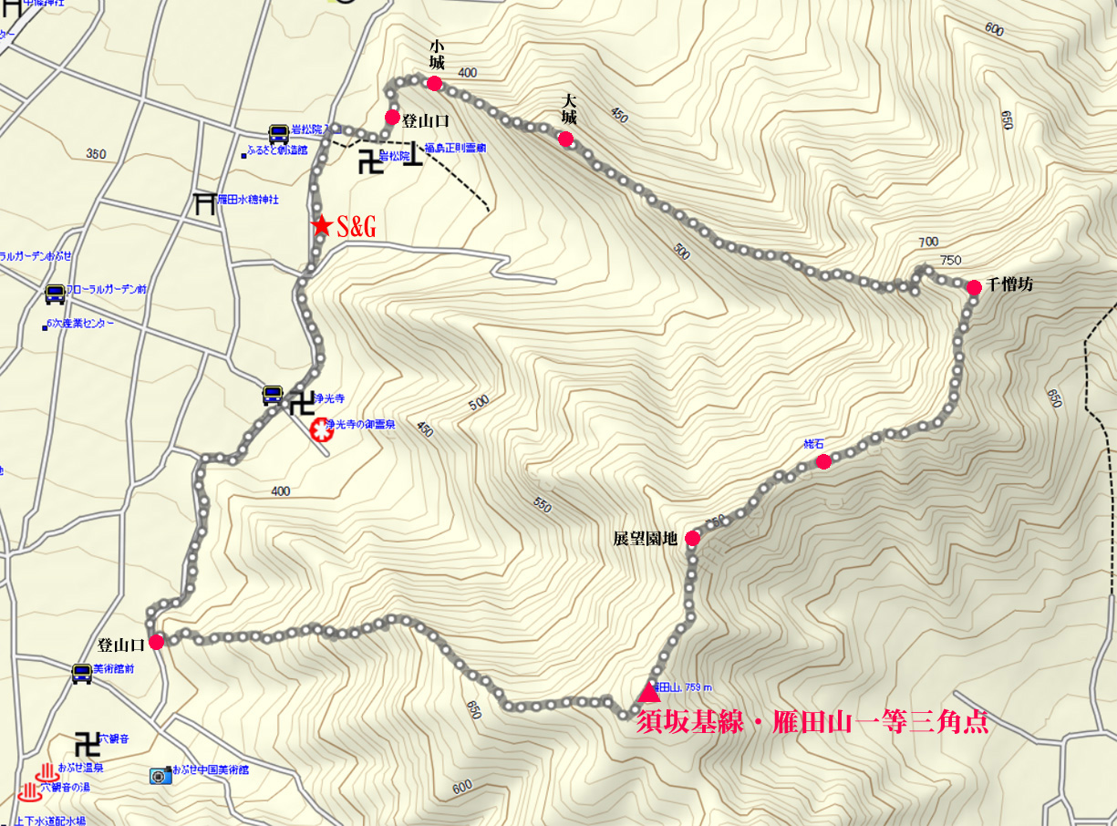 雁田山ルート地図 地図記載文字訂正 ×千憎坊 ○千僧坊 |