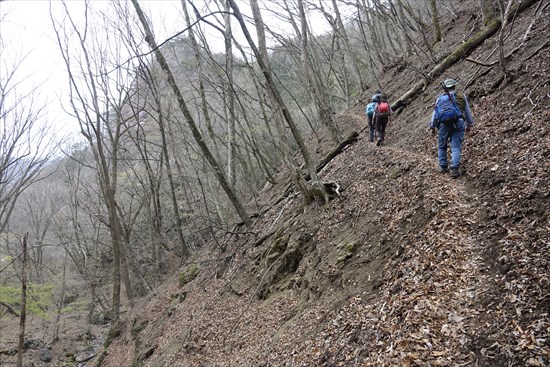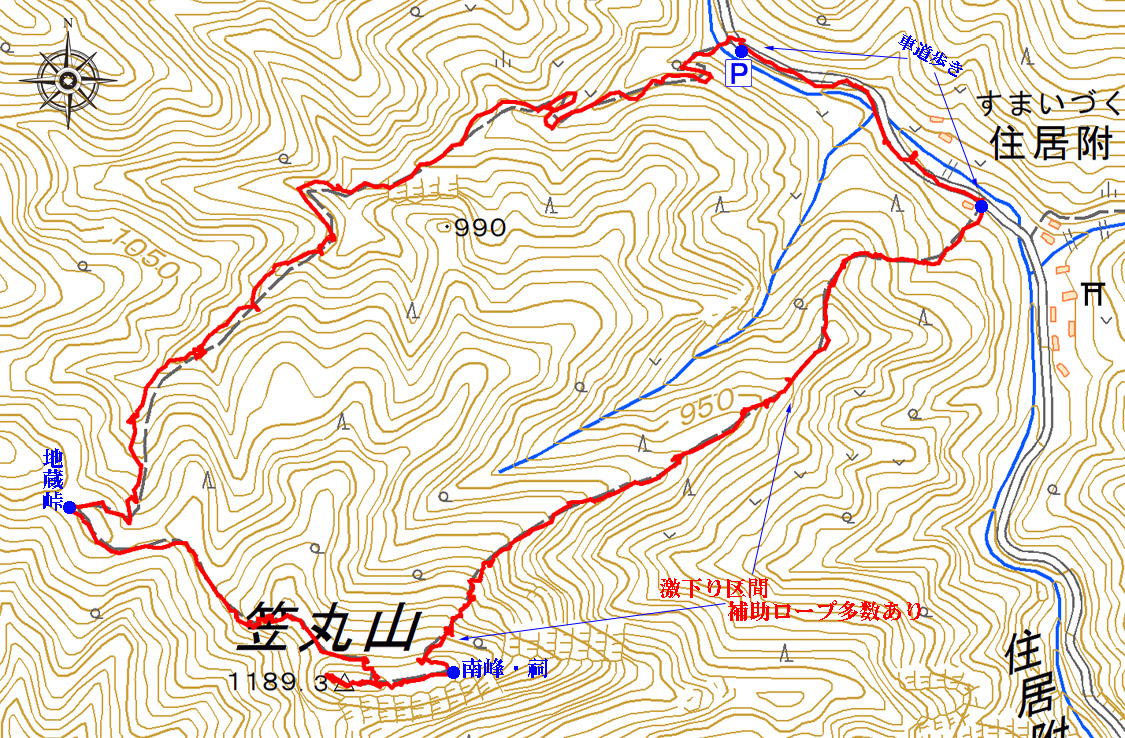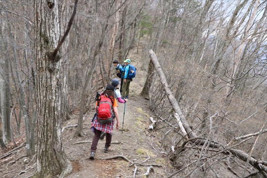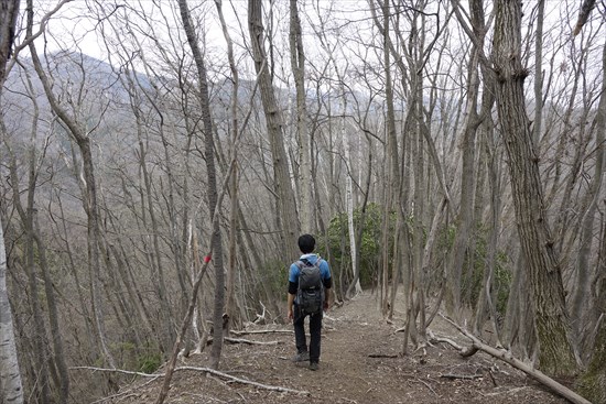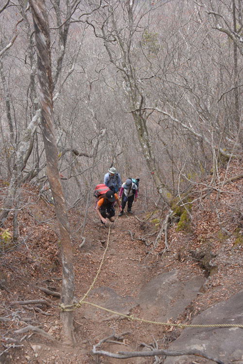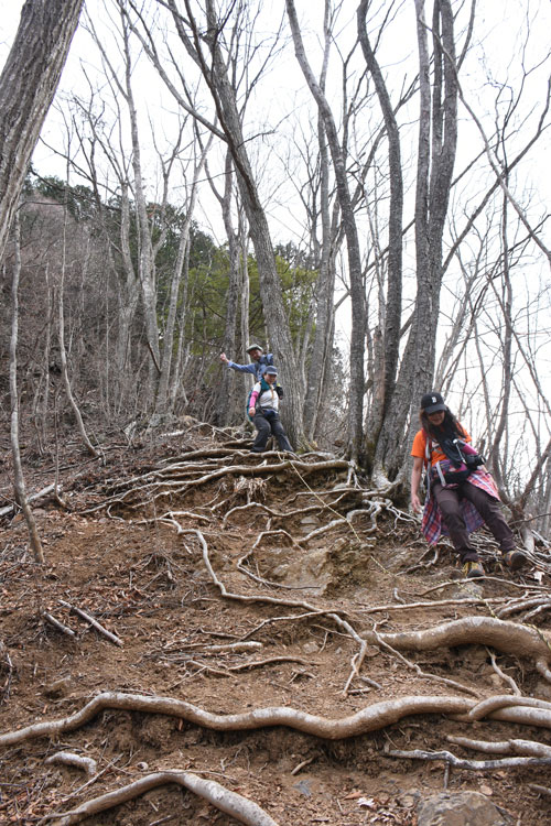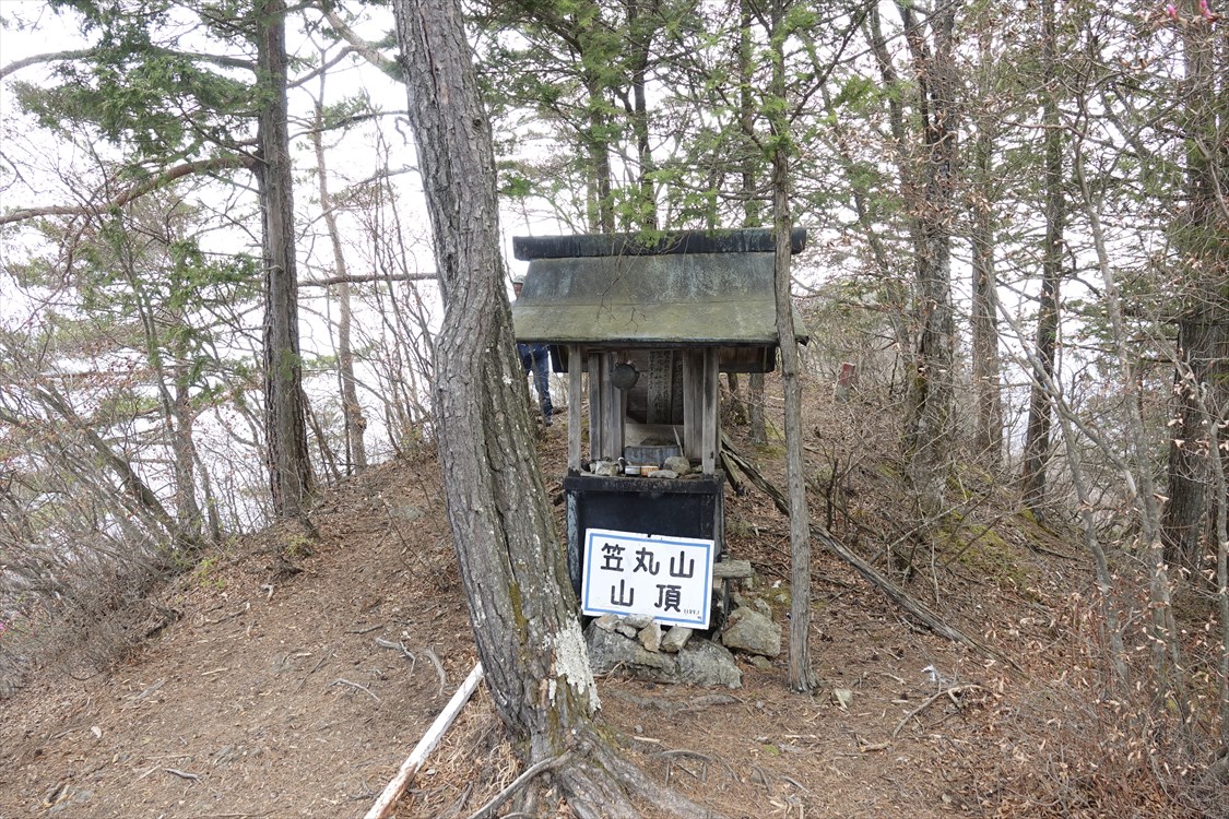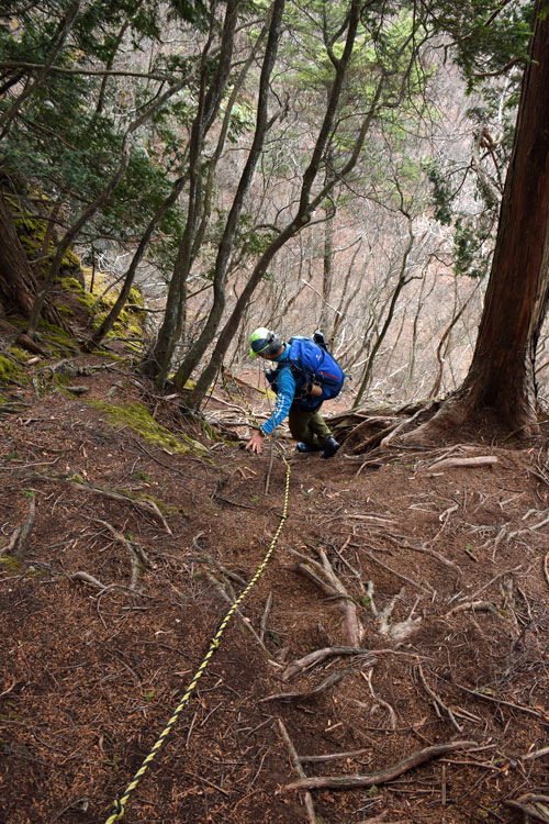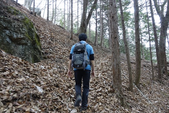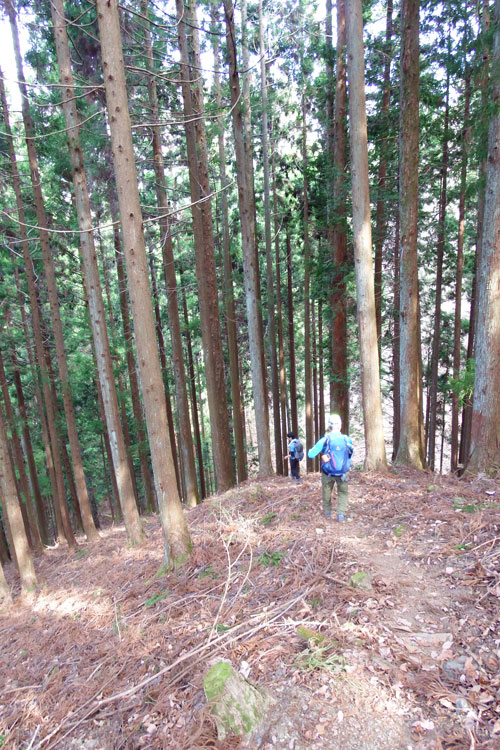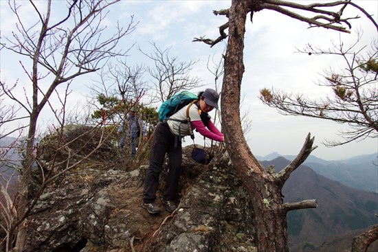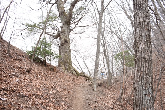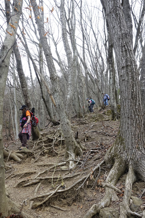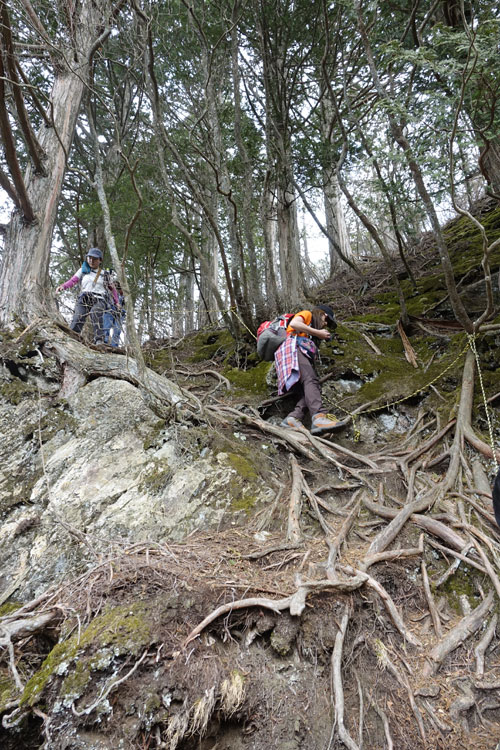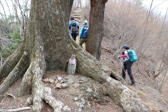 南峰には指導標がないので祠の前にある赤テープを目印に住居附Rを下る |