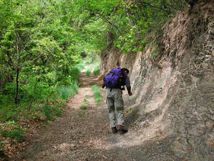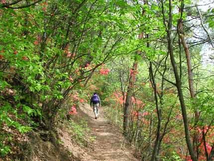 神社裏の遊歩道がゆっくりと山腹を上って行く。二百メ−トルほどで、右へ「近道登山道」が分かれる。