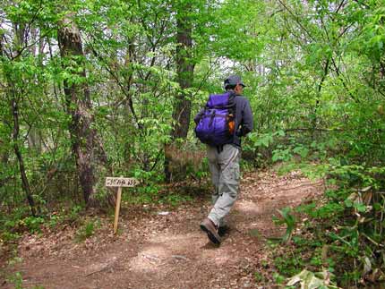 左手にヒノキの植林が現れるとほぽ九合目。 平坦な林に入って、左から福井コ−スが合流。