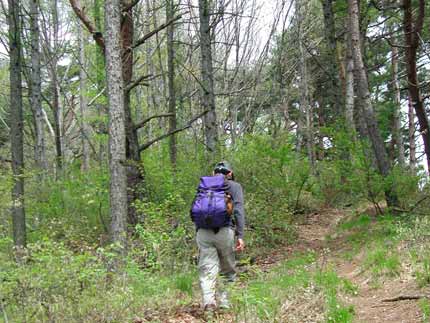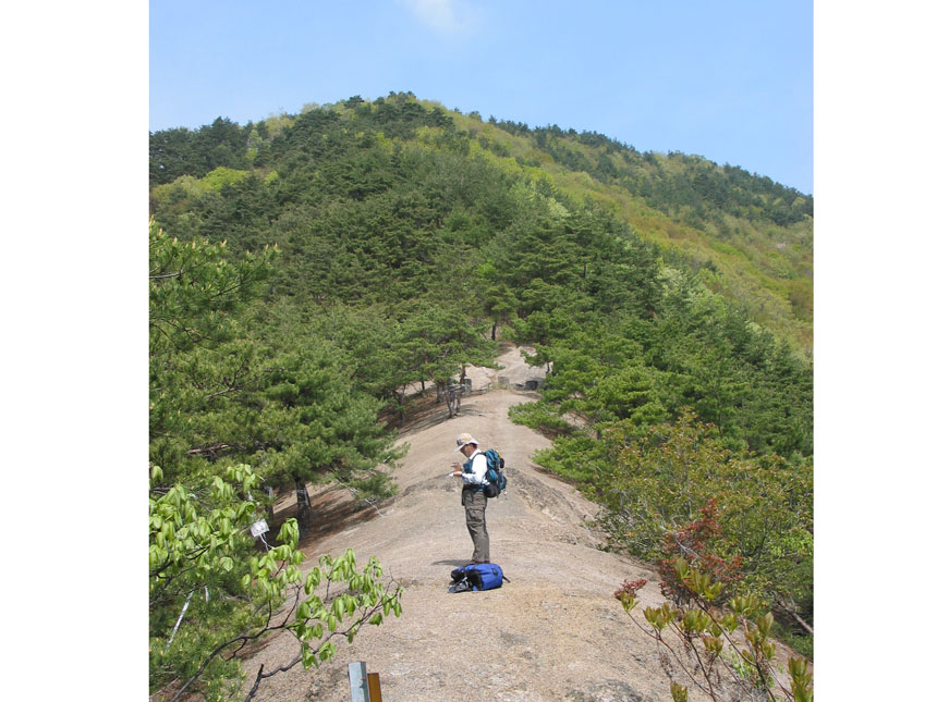 ここから幅の広いゆるやかな尾根が五里ヶ峰へ続く。 アカマツ、カラマツの植林地だから展望は望めない。