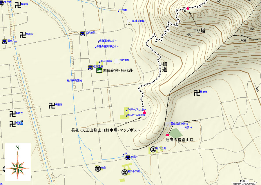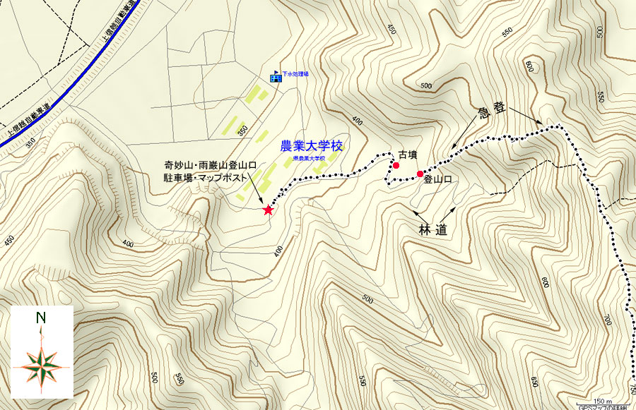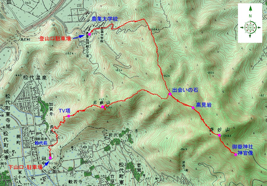 (計曲線 50M 主曲線 10M) 農業大学校P標高/380M 尚和寮跡地P標高/355M 標高差/744.5M 総歩行距離/10442M |