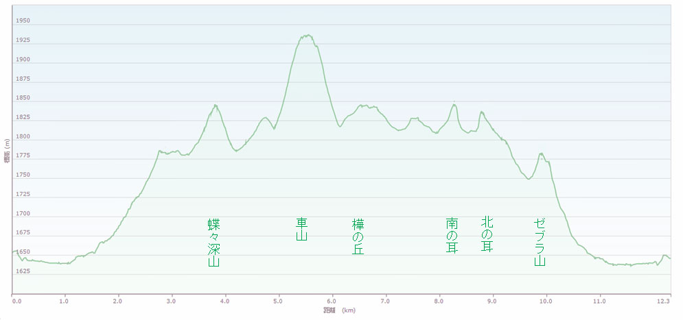 駐車場標高/1640M 最低標高地点/1630M 標高差/295M 総歩行距離/12359M | ||||