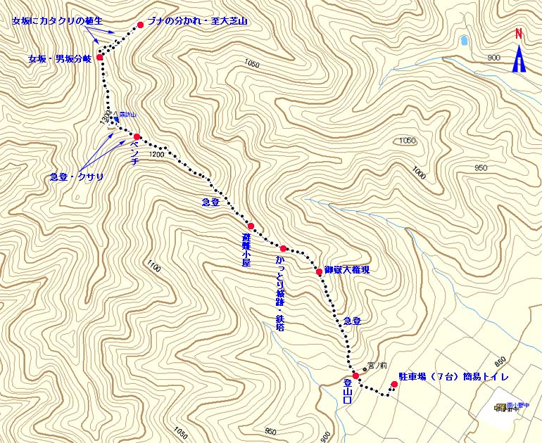 (計曲線 50M 主曲線 10M) 駐車場標高/872M 標高差/433M 総歩行距離/5261M |