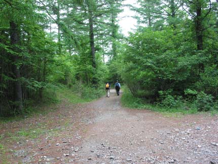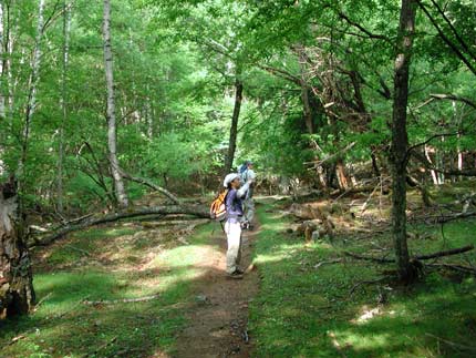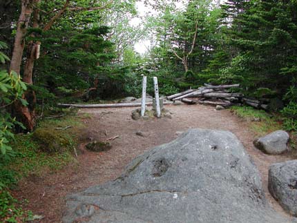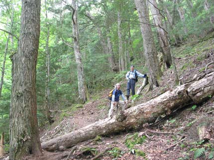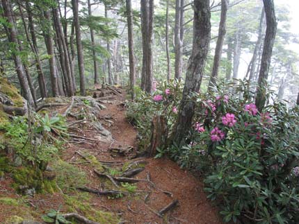 源流広場から道標に従い樹林帯の急斜面を登ると稜線上に出て国師ヶ岳方面からの分岐点と合流する。