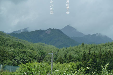 林道取り付きからの小八郎岳と烏帽子岳 (帰路途中に撮影) |