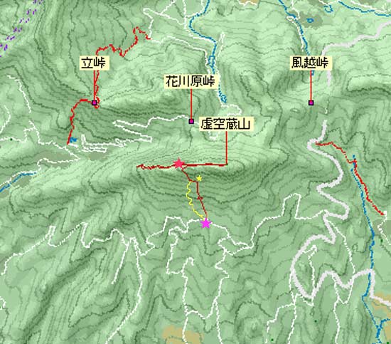 ![]() ピンク星・駐車場 黄色星・岩屋神社 赤星・写真の岩稜 黄色ルート 四十八曲り 虚空蔵山に記載の赤ルートは行動軌跡です。 |
