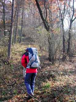 ここは開けた唐松林で、高圧線巡視用の鉄塔番号を記した小さな標住が立っている。