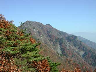 国道18号の上田市塩尻付近で見上げる虚空蔵山は険しい岩場を連ねて近寄り難い感じがする。