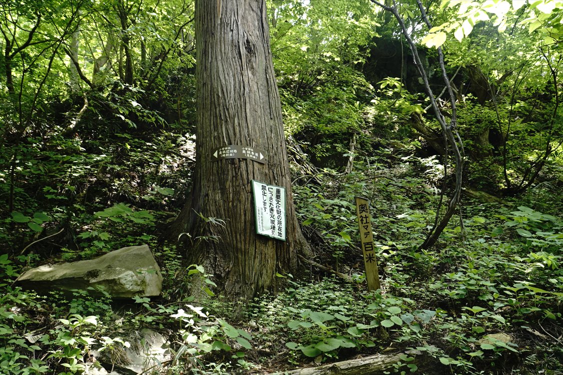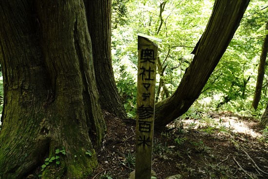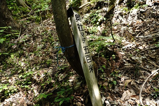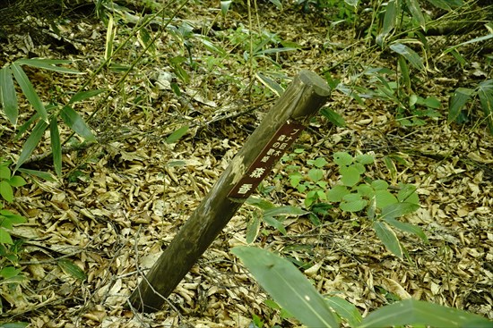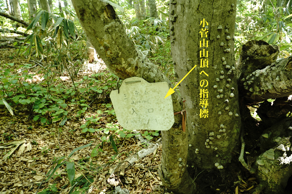 分岐点から2㍍ほど先の巨木に目立たない指導標(三角点まで200㍍入口)あり |