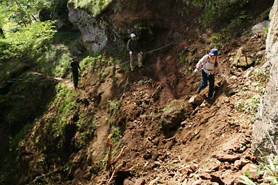 頭をゴツン!しないように背をかがめて | 土砂崩落の生々しい傷跡がある | |||