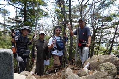 笹原樹林帯になると山頂が近い | 庚申山山頂 なんちゃん・伊藤さん・管理人・だんべえさん |