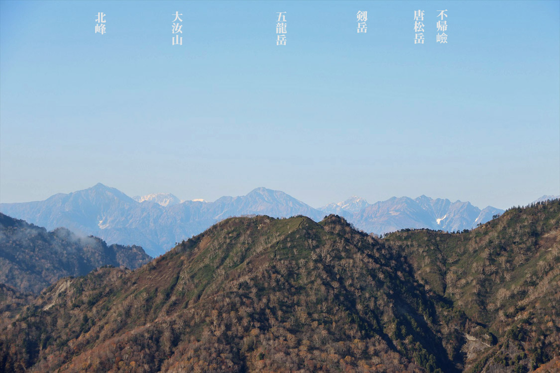 右から乙妻山・高妻山・戸隠山の峰々・奥に北アルプス&剱岳 | ||||