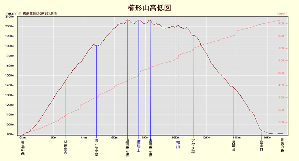 県民の森P標高/890M 標高差/1161.7M 総歩行距離/16626M 総休憩時間/146分 |