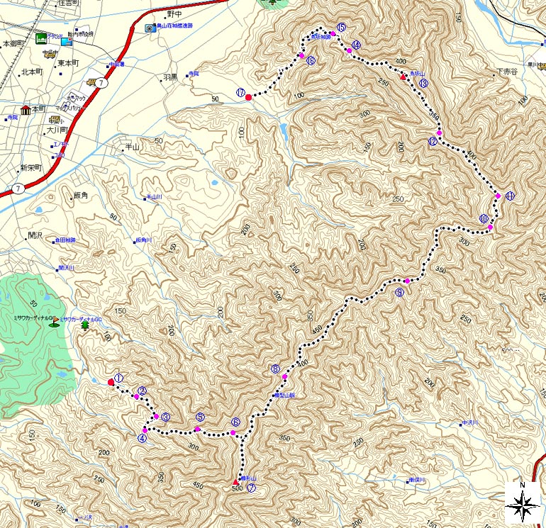 (計曲線 50M 主曲線 10M) 関沢森林公園標高/125M 宮ノ入登山口/58M 標高差/510M 総歩行距離/11751M |