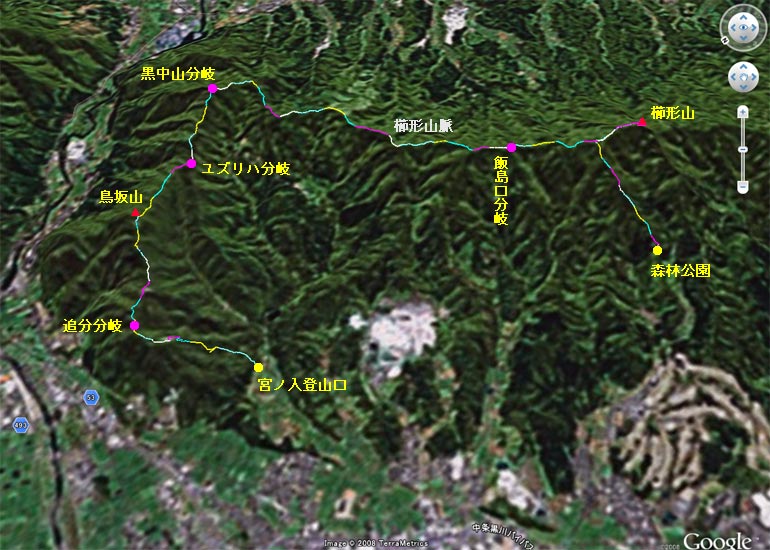 @関沢森林公園 A山の神R登山口 B山の神 C大沢駐車場分岐点 D市ノ沢城跡分岐点 E市ノ沢R分岐 F櫛形山 G飯角口・いいずみ分岐点 H胎内スキー場方面展望良 I板入峰 J黒中山分岐点 Kユズリハノ峰 L鳥坂山・とっさかやま&胎内観音R分岐点 Mマイクロウェーブ N追分(白鳥公園)R分岐点 O白鳥R分岐点 P宮ノ入R登山口 |
