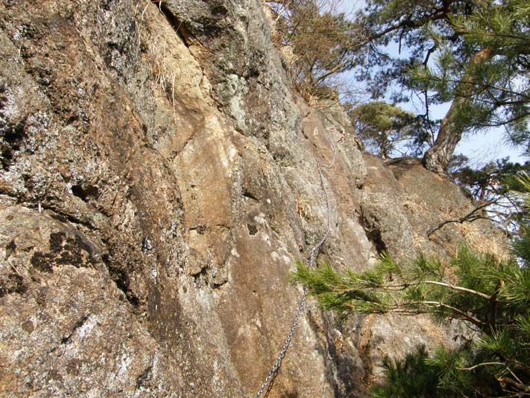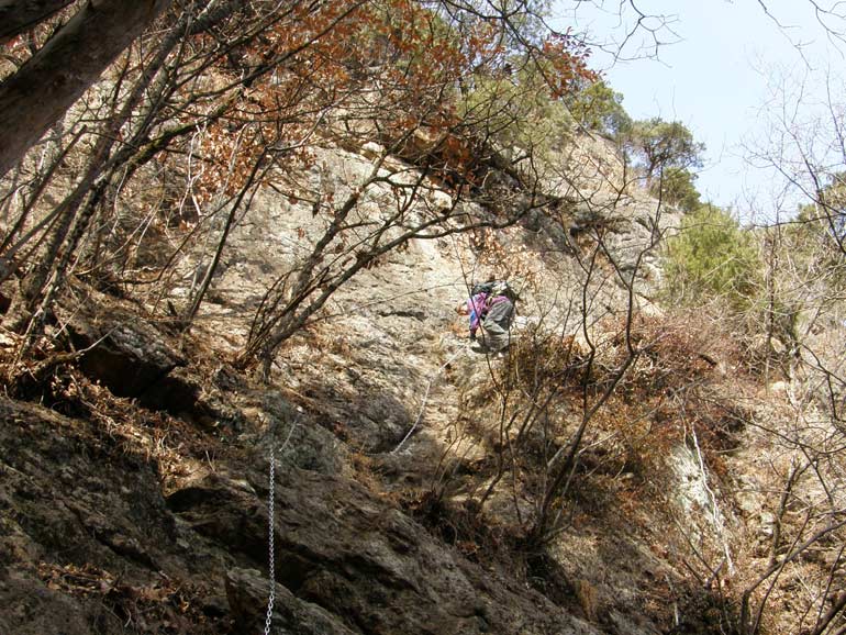 クサリ場に着く。 足や手のとっかかりが至るところにあるのでクサリを補助に登れば安全ではあるが