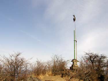 クサリが終わって痩せ岩稜部に立つと幟はためく山頂が近い。 ここも左右に切れ落ちており