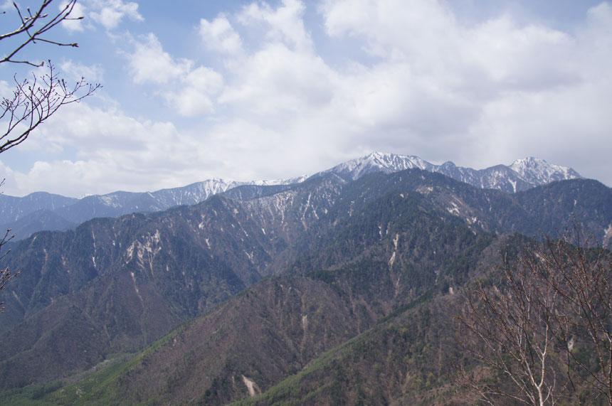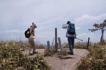 しばしの休憩で展望を楽しむ | ↑ 南峰手前の展望適地で北アルプス展望 ↓ | |||