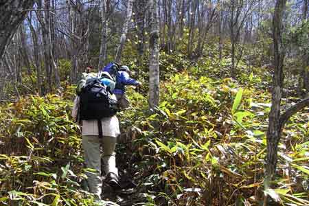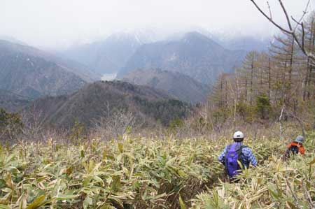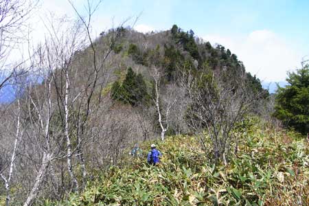 里山特有の笹原地帯を登る | 鍬ノ峰・南峰が見える/南尾根の嶺より | |||