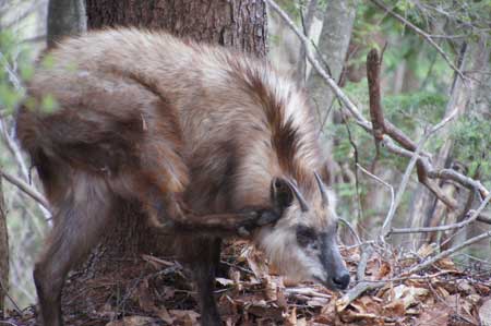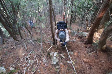 イワウチワ撮影中の管理人 | 急斜面には長〜い補助ロープが張られている | |||