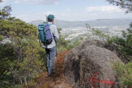 雨で濡れる砂礫の急斜面を慎重に下る | 観音寺鐘突き堂・展望台に到着 | |||
