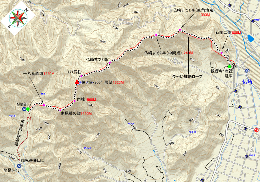(計曲線 50M 主曲線 10M) 観音寺庫裡標高/755M(常盤R駐車場所・1100M) 標高差/868M 総歩行距離/7499M |