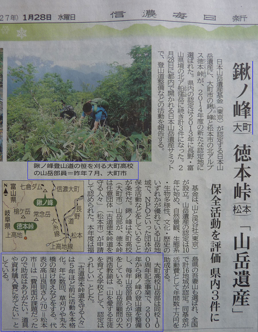祝・日本山岳遺産登録 2015.1.28 信濃毎日新聞記事より |