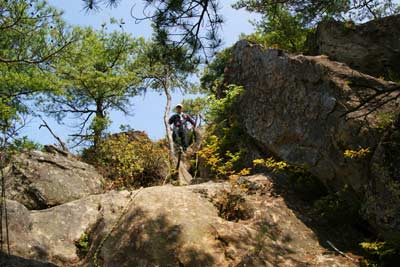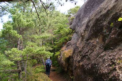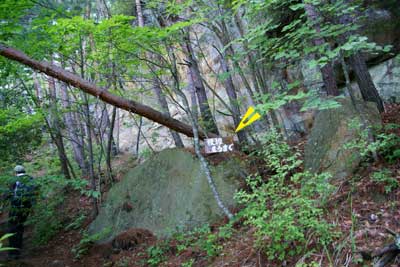 高度を上げる | 《写真にマウスを》 稜線もうすぐの道標と背後の大岩 |