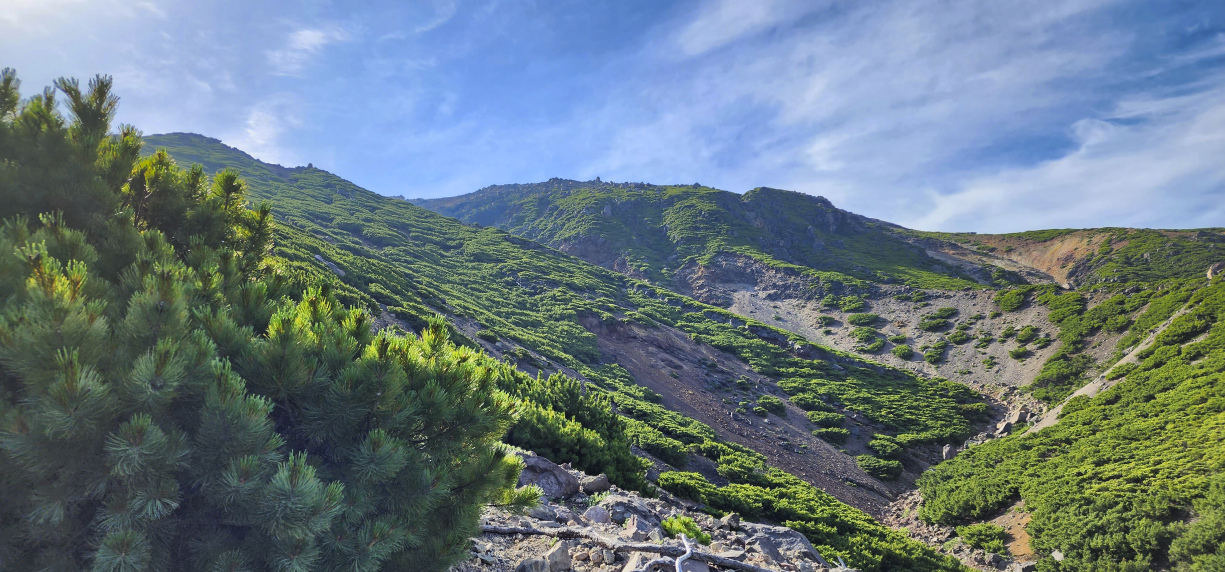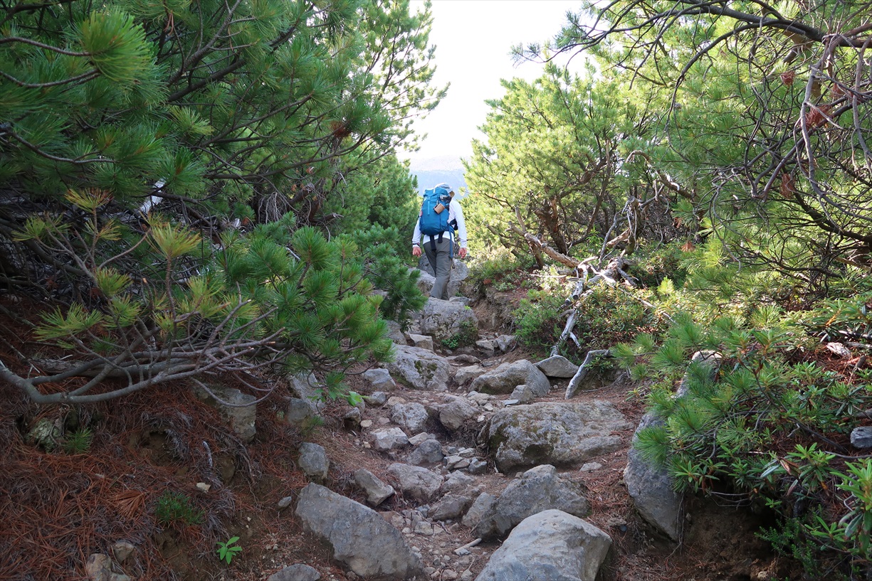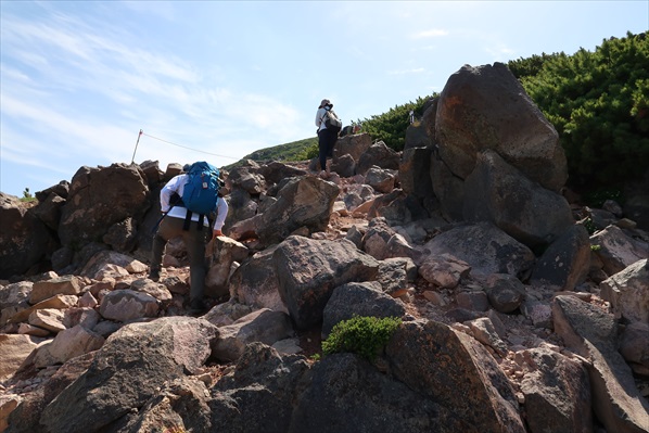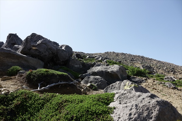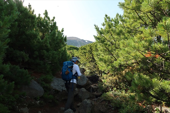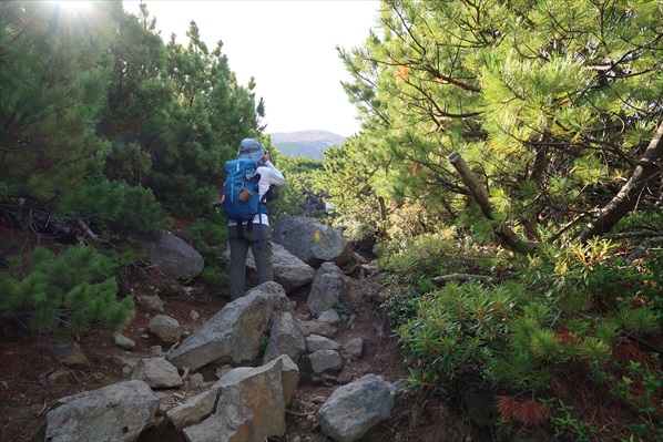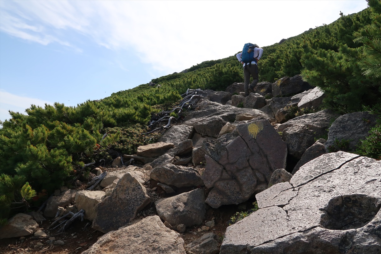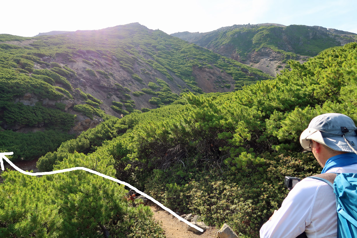 涸れ沢を通過して対岸のハイマツ尾根に取り付く | ||||
