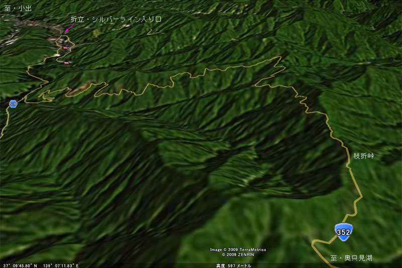 熊が飛び出してきそうな山道を枝折峠に向けて走る | ||||