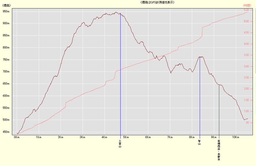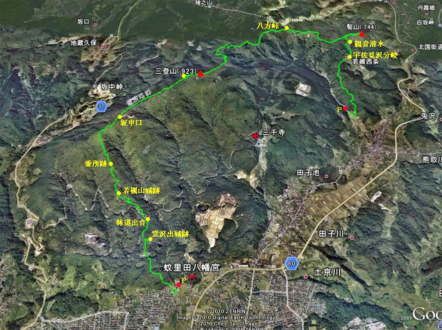 三登山−髻山鳥瞰図 SP駐車場標高/432M 標高差/491M 総歩行距離/10545M |