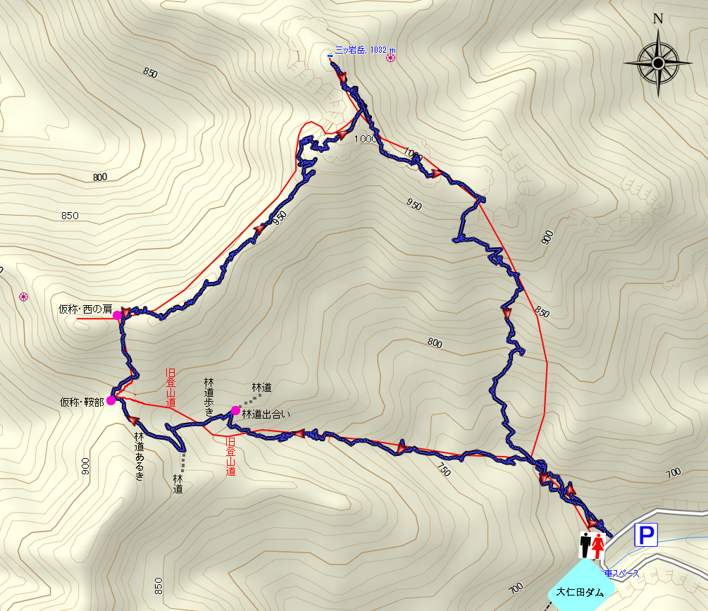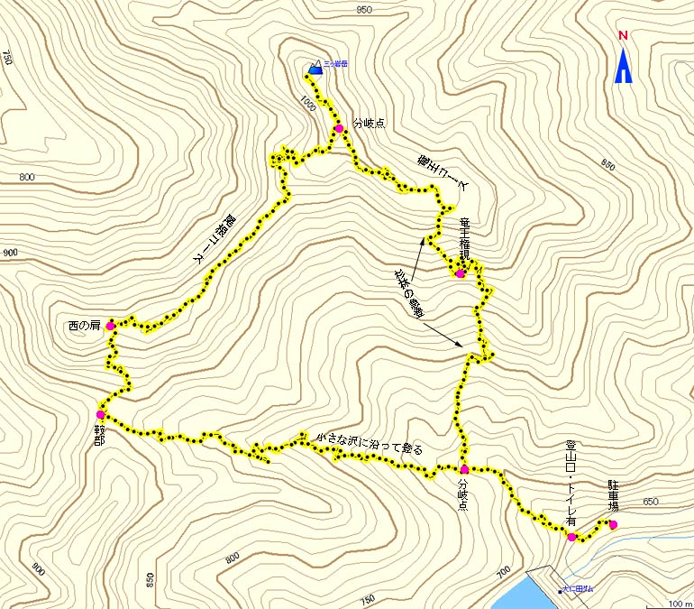 三ッ岩岳登山地図 (注)地図記載の「西の肩」と「鞍部」は便宜上使用したもので正しい表記ではありません |