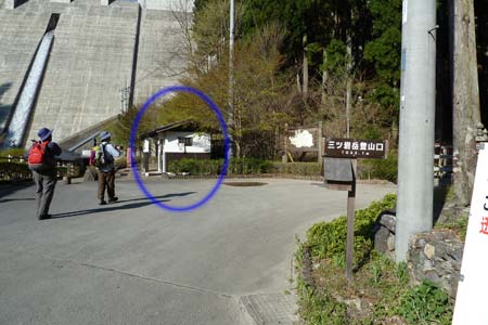 ダム下の登山口に設置された迂回路案内板 | 大仁田ダム・トイレ奧(○囲み)奧が仮登山口 | |||