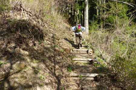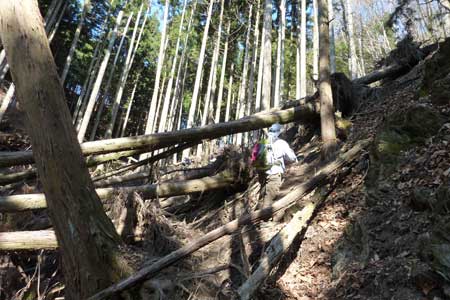トイレ横の架設登山口を上る | 登山道に覆い被さる倒木 | |||