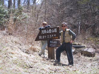 枝線林道へ入る。そこには「茂来山登山口」の標識がある。 1.5kmで登り口広場に着く。