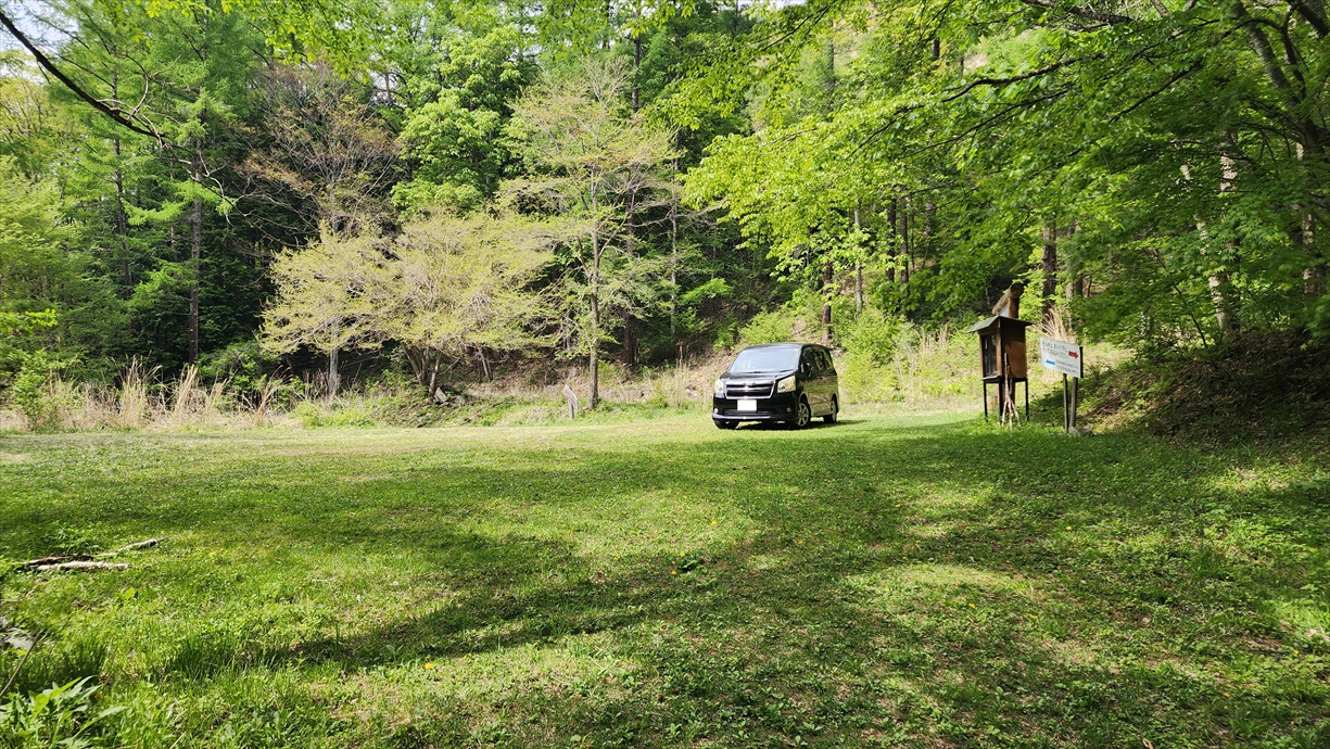 低床車は腹をこする可能性大なのでこの駐車場より200b手前の芝生広場に駐めるのがベスト |
