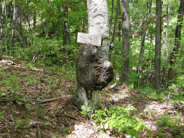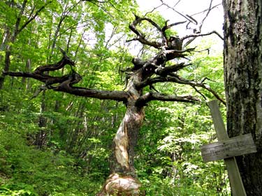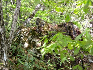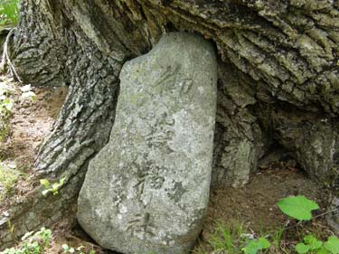 《写真にマウスを》 御嶽神社と記されている⇔ブナの大木根元に |