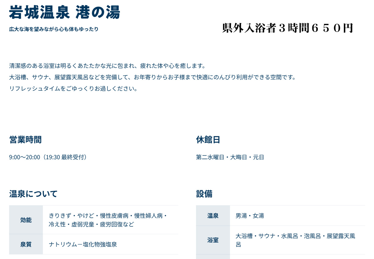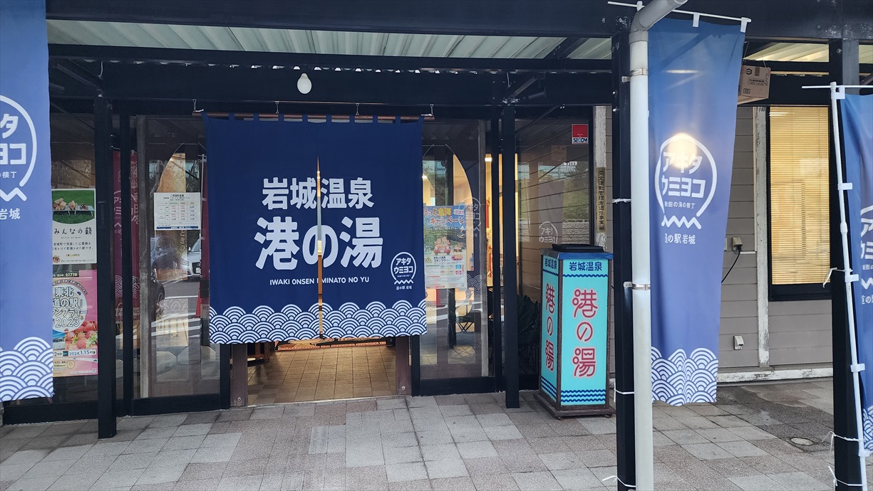 道の駅 岩城の敷地に併設「岩城温泉 港の湯」 2023年7月3日長野出発11時〜道の駅到着が午後6時過ぎだったので道の駅レストランは閉店していました |