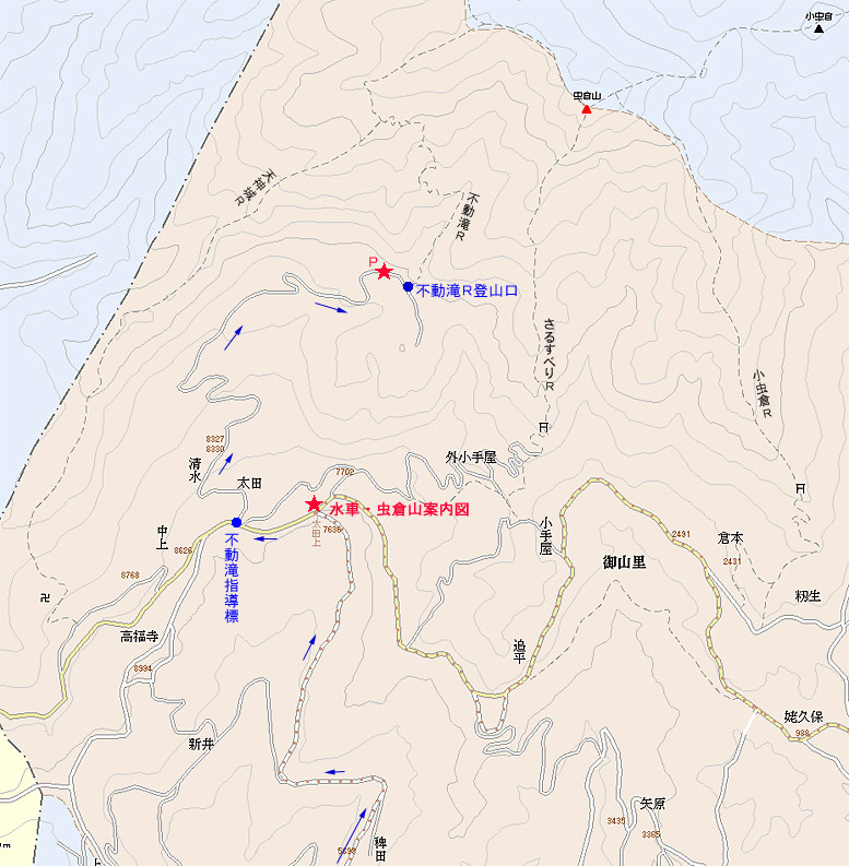 太田地籍(水車小屋・虫倉山案内板)マップコード 382-496-379 不動滝駐車場(4−6台)マップコード 382-526-118 |