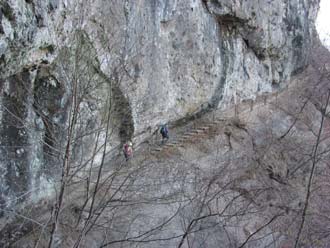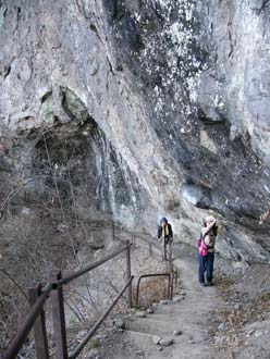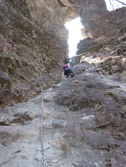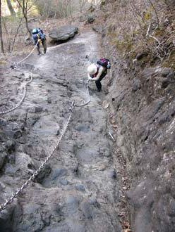 石門の鎖場(左写真の裏側はカニの横這い) 初挑戦の美礼さんは、この鎖場で味をしめたか?以後の難関な鎖場も楽々クリア。 |
